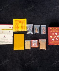 Trọn bộ sản phẩm bao gồm: Ngọc trai + Hổ phách + San hô đỏ + Ngọc bích (phỉ thúy) + Đá mã não đỏ + Bột ngũ vị + Vàng lá + Bạc Lá + 1 tờ trang kim + Nụ trầm + Thạch anh ngũ sắc bóng + 20 gram gạo vàng thần tài + Chỉ ngũ sắc + Dị hiệu + Hướng dẫn sử dụng
