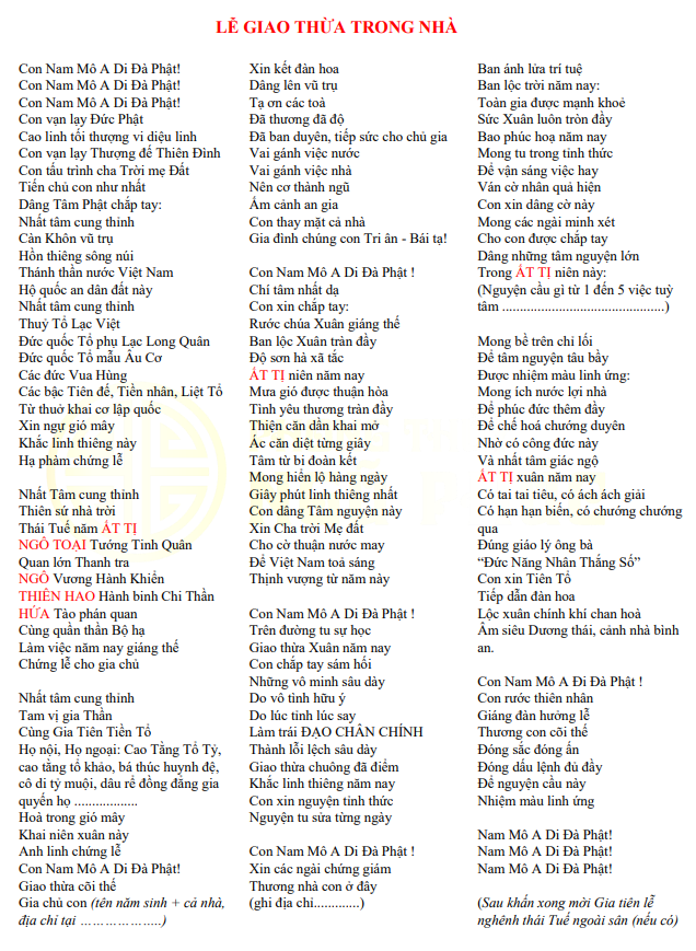 Nam Mô A Di Đà Phật! – Con lạy chín phương Trời, mười phương Chư Phật, Chư Phật mười phương. – Con kính lạy Ngài Địa Tạng Vương Bồ Tát. – Con kính lạy ngài đương niên Thái Tuế Chí Đức Tôn Thần, Đương Niên Hành Binh chi tuần, Đương niên Tào Phán quan.