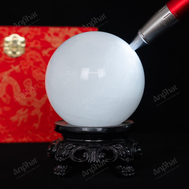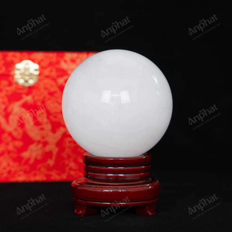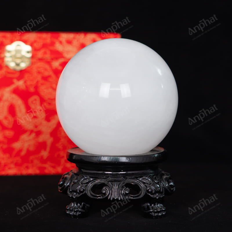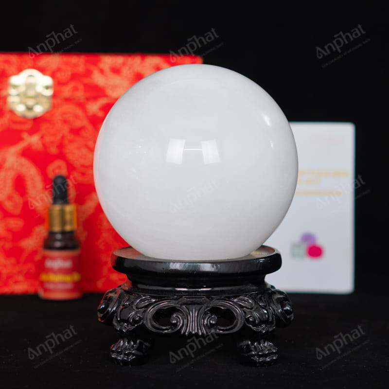 - Trọn bộ sản phẩm bao gồm: quả cầu + 01 đế gỗ + hộp nhung cao cấp + túi giấy sang trọng + dầu dưỡng đá + thiệp + giấy kiểm định chất lượng đá